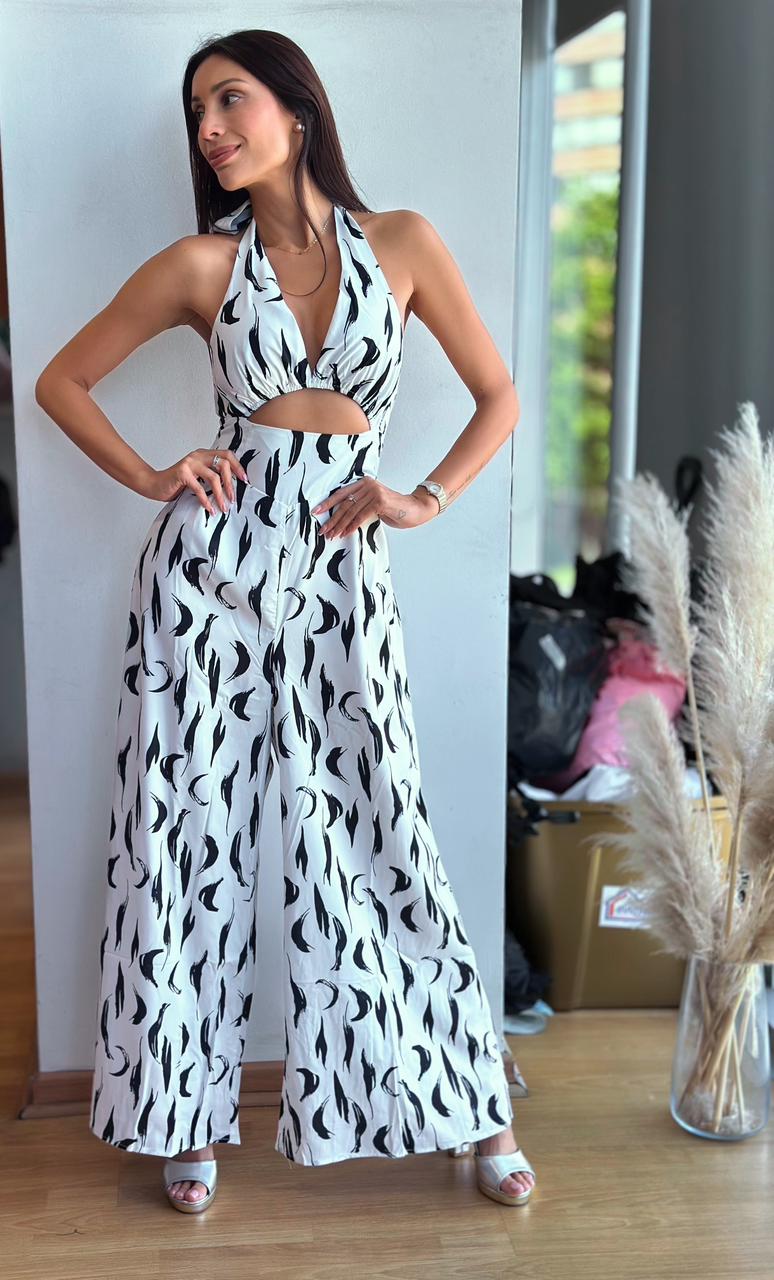 Este elegante enterizo presenta un llamativo estampado abstracto en blanco y negro. Diseñado con un escote halter que se ajusta con un nudo en el cuello y una espalda también anudada manualmente, ofrece un ajuste personalizado y moderno. Cuenta con un corte a la cintura que añade un toque chic. Ideal para lucir sofisticada y a la moda.