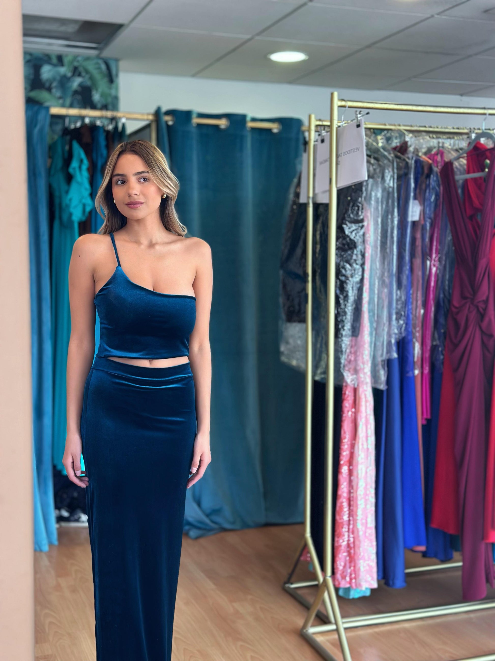 Atrae todas las miradas con este cautivador vestido de terciopelo azul petróleo. Su diseño asimétrico, combinado con un sofisticado tajo y abertura lateral, proyecta una elegancia moderna y misteriosa. La rica profundidad del azul petróleo y la suave textura del terciopelo lo convierten en la elección perfecta para eventos donde quieras dejar una impresión duradera.