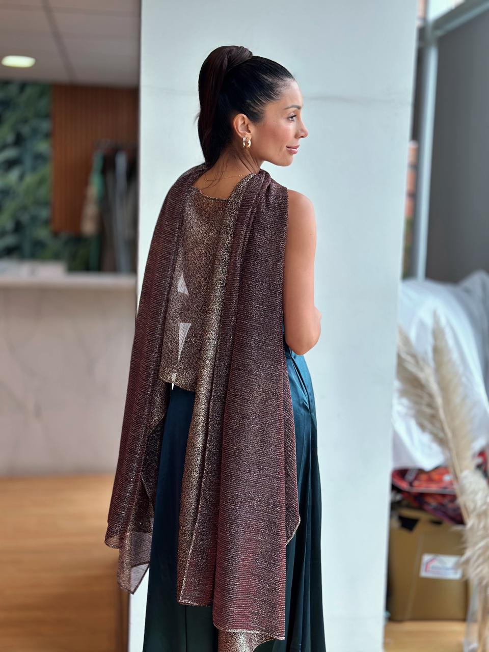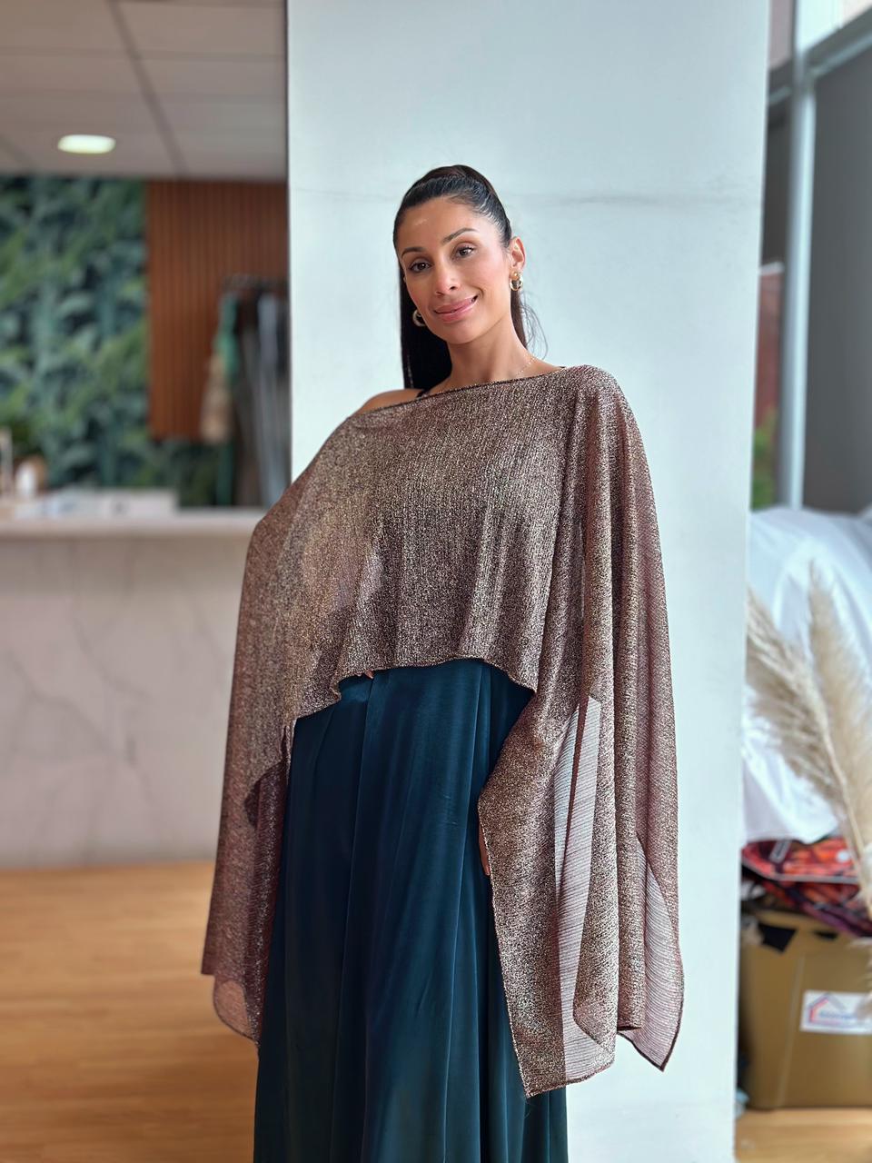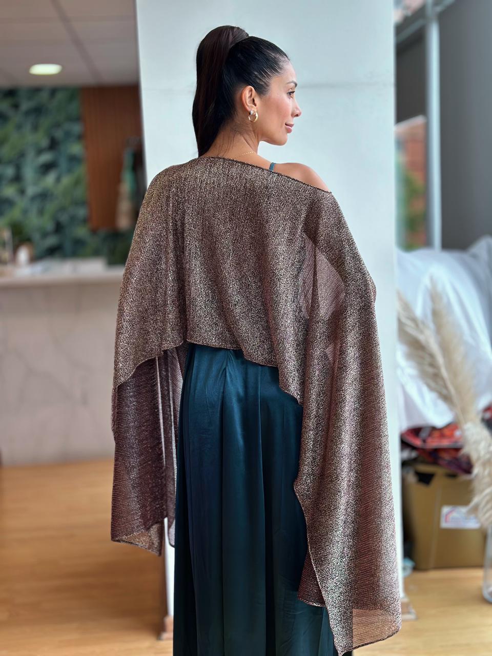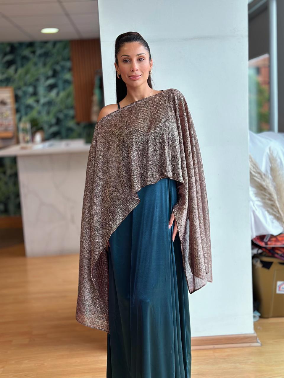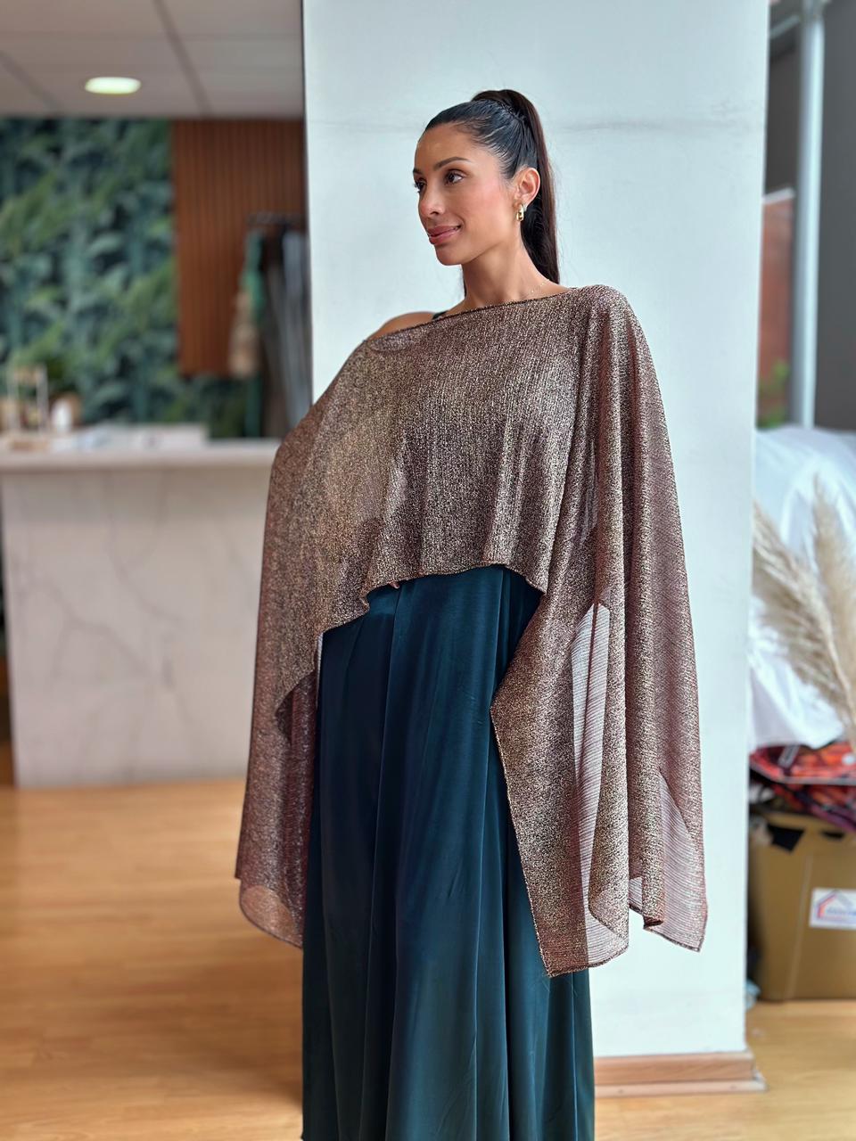 Confeccionada con un tejido ligero y una caída fluida, esta capa es el complemento perfecto para tus vestidos de fiesta, tops elegantes o incluso para elevar un conjunto casual-chic. Sus hilos delicados incorporan un brillo sutil que se ilumina con cada movimiento, sin ser excesivo, aportando un aura de glamour y distinción en un tono versátil y sofisticado.